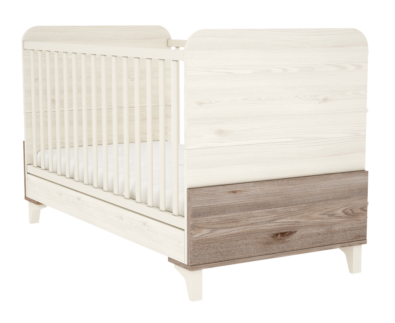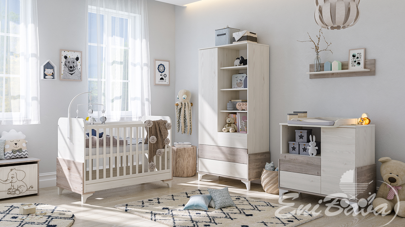 • A kiságy ívelt bükkfa lábakon áll, amik letisztult modern külsőt kölcsönöznek a terméknek és lehetővé teszik a szekrény alatti rész egyszerű takarítását.