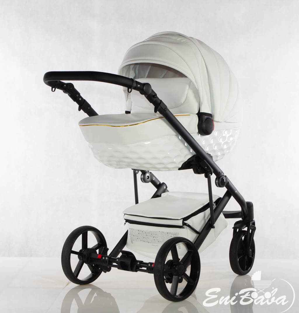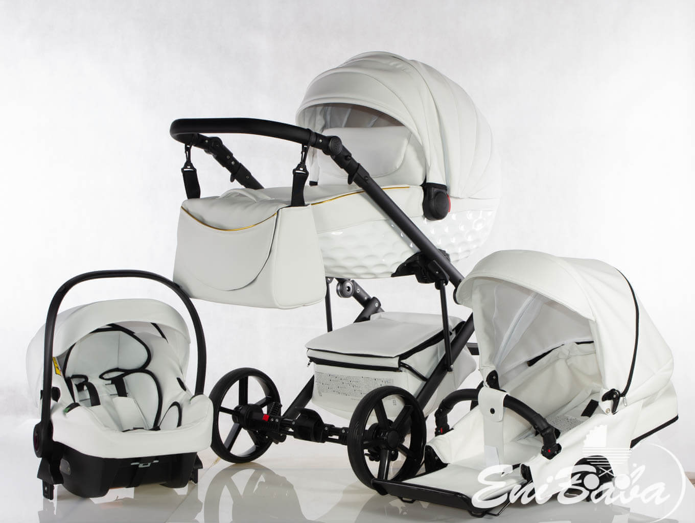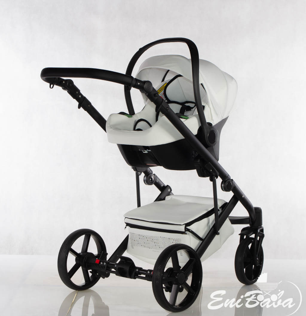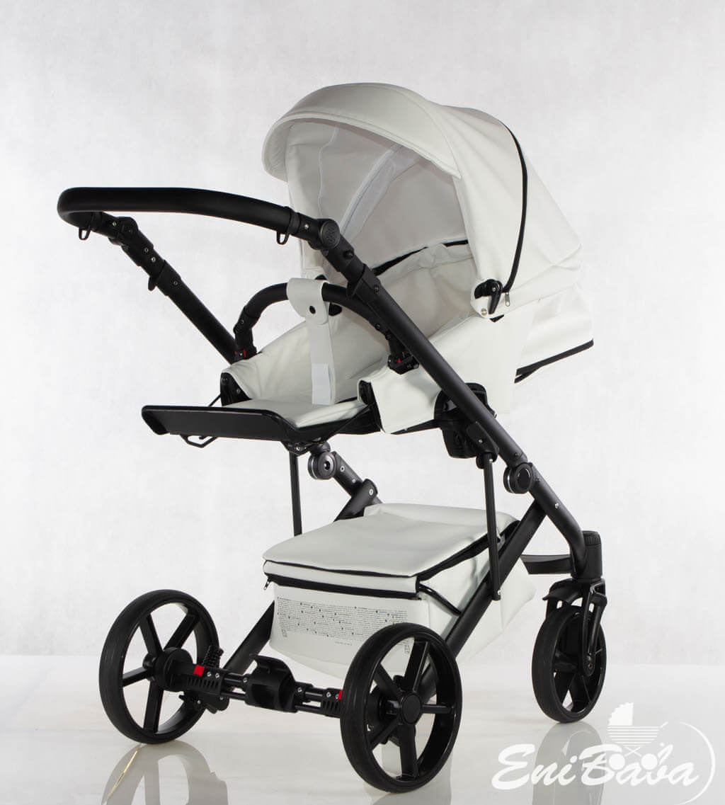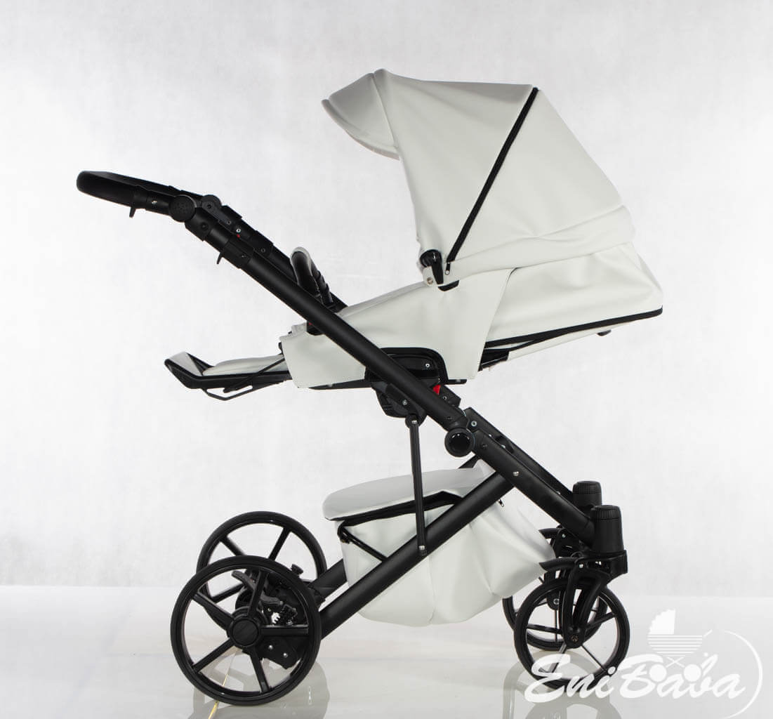 • A babakocsi számos eleme, mint például a tolókar, a gondola hordozó fogantyúja, a karfa és a babakocsi lábtartója tartós öko-bőr borítással készült.