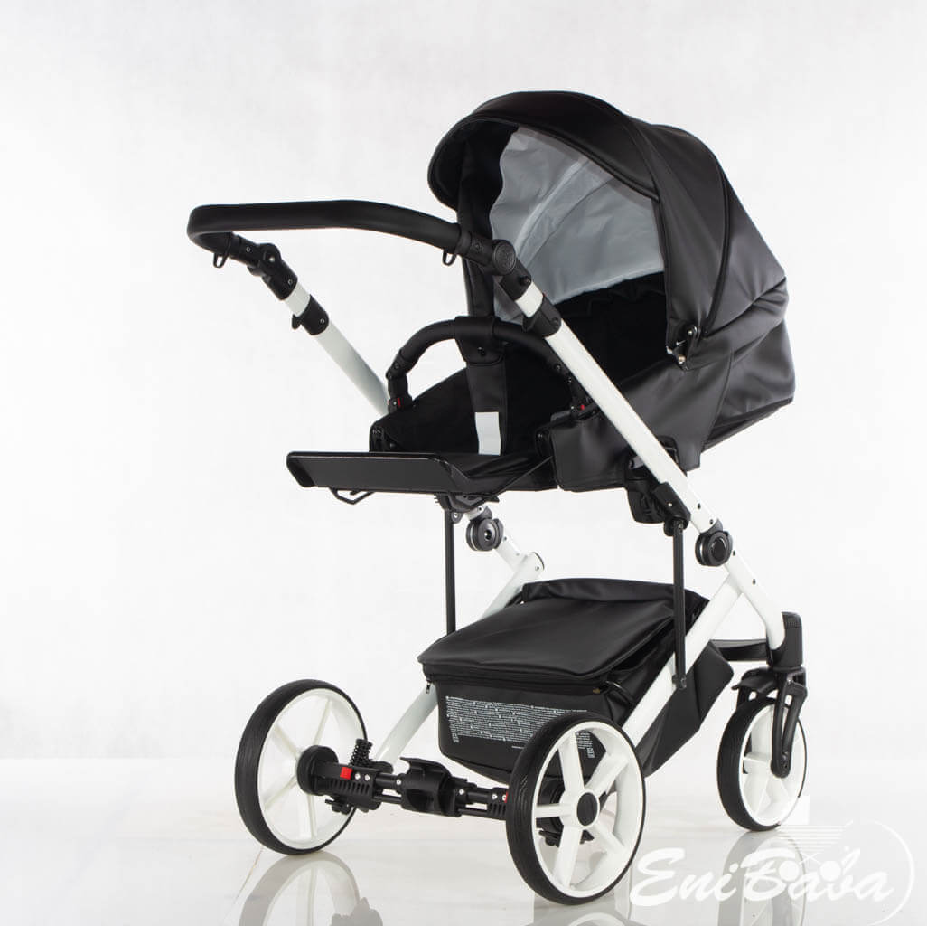 • A babakocsi számos eleme, mint például a tolókar, a gondola hordozó fogantyúja, a karfa és a babakocsi lábtartója tartós öko-bőr borítással készült.